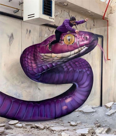 The locations of Scaf's art vary, but are almost always in neglected places such as factories, houses, or even unused swimming pools. Once he gets to work, however, the walls quickly transform into portals for life-size characters to appear. In some of his works, it looks as if a dragon's head is emerging from a dark cave, or a giant crocodile is emerging from a blazing arch.