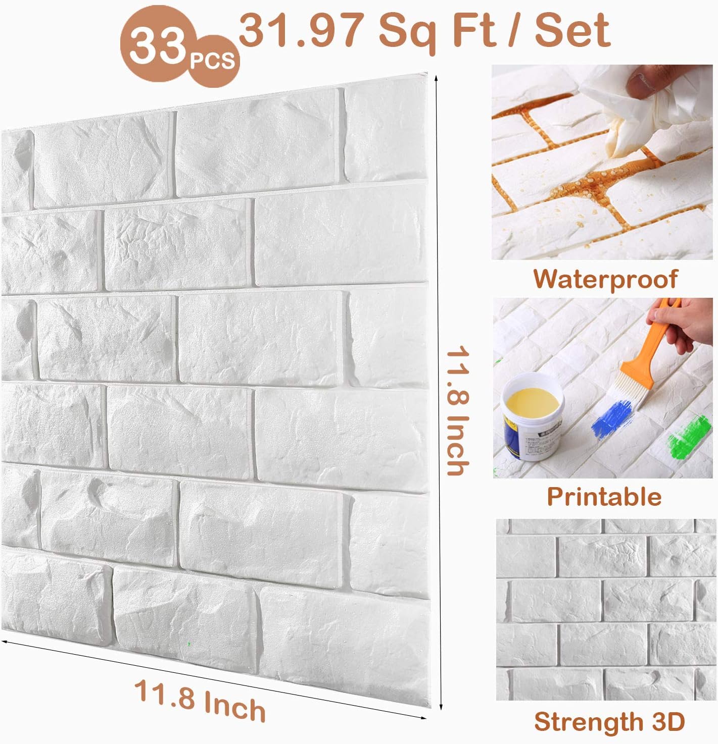 Die Dicke unserer 3D-Wandpaneele mit Struktur beträgt bis zu 1/4 Zoll, und jeder Satz 3D-Wandpaneele aus weißem Ziegelstein enthält 11, 20 oder 30 Tapetenstücke, die eine Fläche von 10,65, 19,38, 29,06 Quadratfuß abdecken können. Wenn bei der Verwendung ein Wagenheber vorhanden ist, können Sie zum Schneiden unser kostenloses Messer verwenden, um den gewünschten Effekt zu erzielen.
