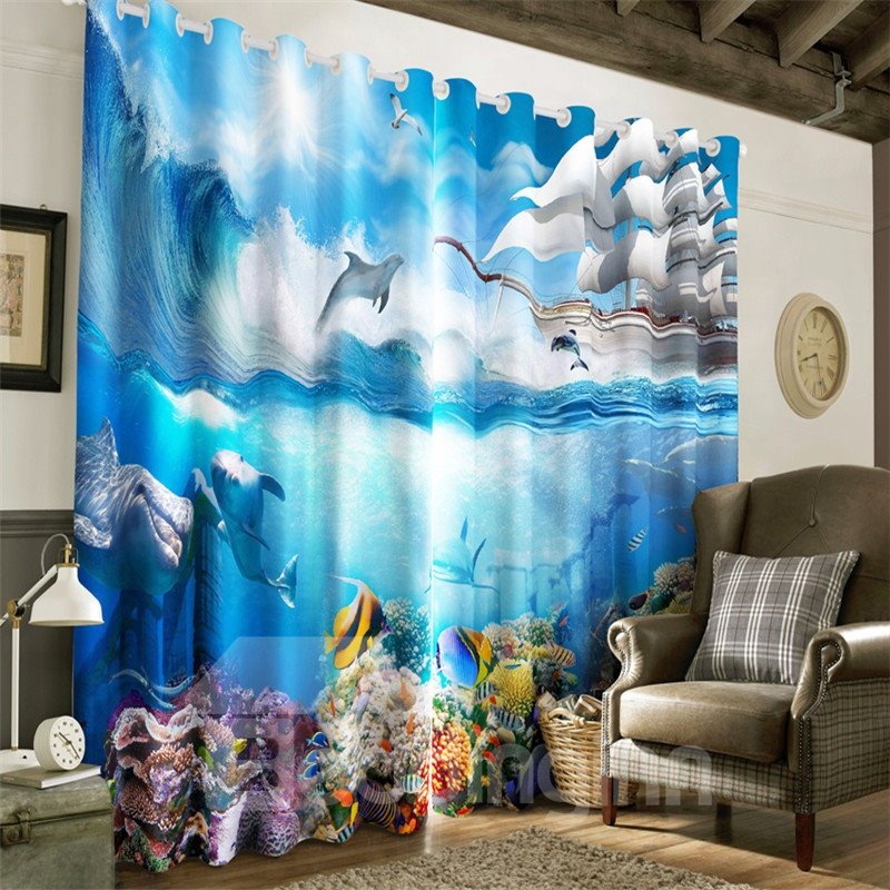 Verdunklungsvorhang mit 3D-Motiv „Blue Seas“, goldene Fische, Schildkröten und Delfine, bedruckt mit wunderbarer Unterwasserwelt