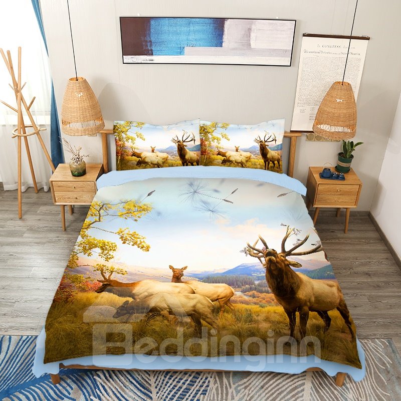 Elchfamilie im herbstlichen Grasland, bedrucktes 3D-4-teiliges Bettwäsche-/Bettbezug-Set mit Tierdruck
