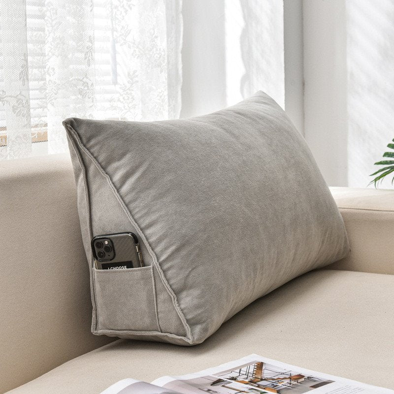 Der Bezug dieses dreidimensionalen dreieckigen Kissens besteht aus Samt und die Füllung besteht aus Polyesterfaser; Die Seitentasche ist praktisch und praktisch und bietet Platz für Mobiltelefone, Fernbedienungen usw