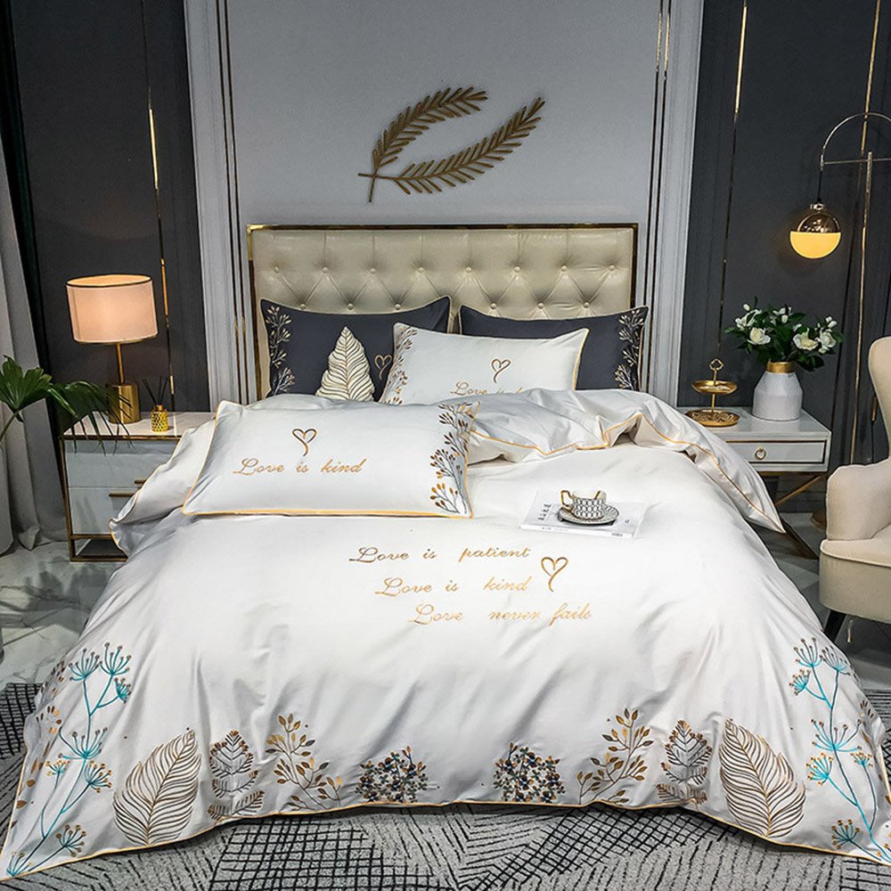 Juego de funda nórdica de lujo moderno de 4 piezas, juego de cama de algodón con bordado elegante blanco, 1 funda nórdica, 1 sábana plana, 2 fundas de almohada, suave, cómodo y duradero