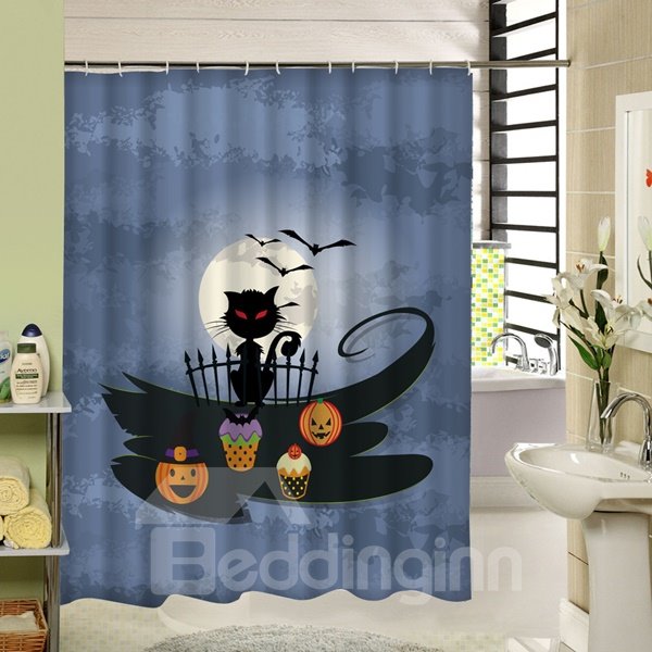 Cortina de ducha con impresión 3D de cartel de Halloween con linternas de calabaza y gato negro sombrío en la noche