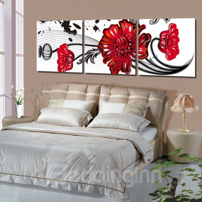 16¡Á16in¡Á3 Panels Red Flowers Hanging Canvas Waterproof and Eco-friendly White Framed Prints