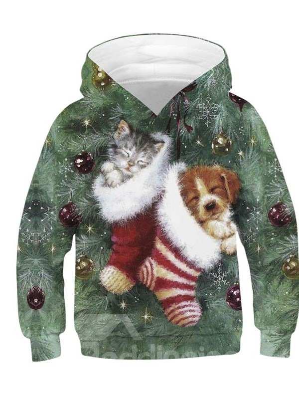 3D Christmas Stocking Sleeping Dog and Cat Printed Long Sleeve Kid's Hoodies Sweatshirts