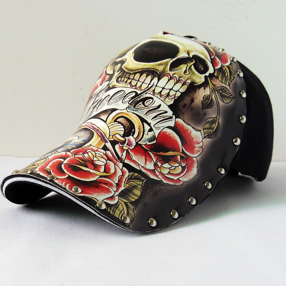 3D Rose and Skull Printed Baseball Cap Punk Rock Rivet Hip Hop Hat Adjustable Snapback Breathable Trucker Hat