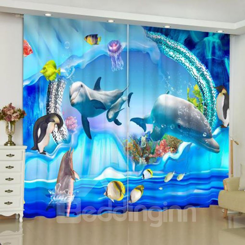 3D Sea World Print Navy Blackout Curtains for Living Room and Bedroom