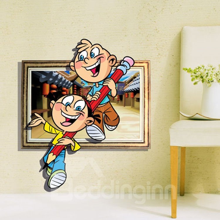 Amazing Creative 3D Kids Carrying a Pencil Design Wall Sticker