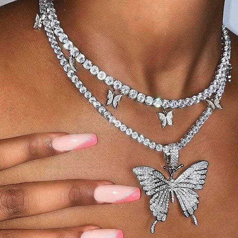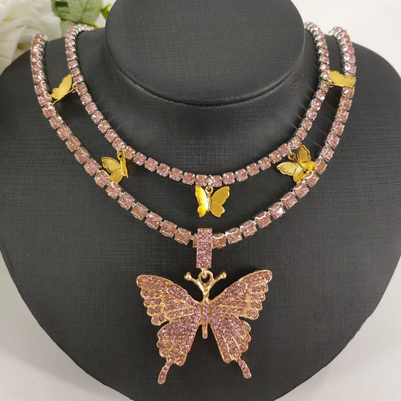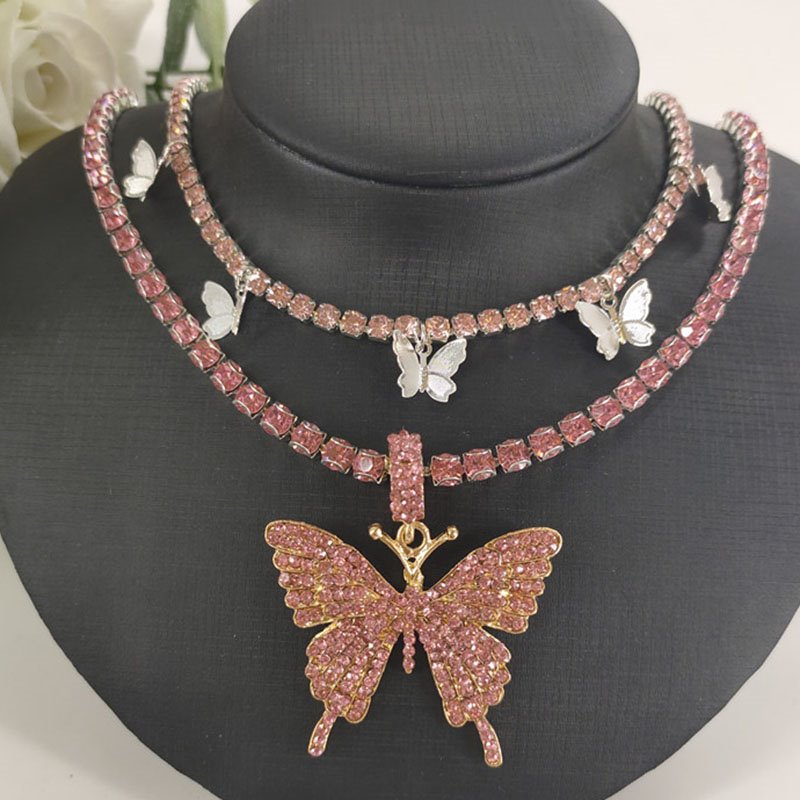 Charming Sparkling Women Butterfly Double Chain Diamante Pendant Necklace Party Jewelry