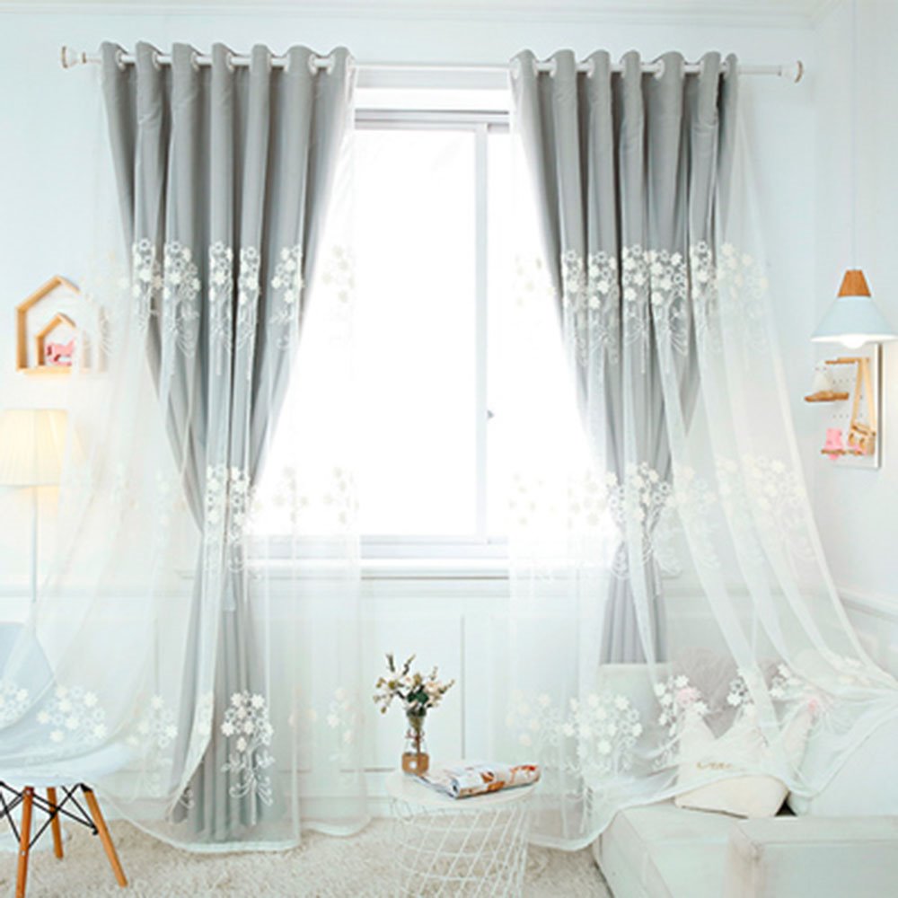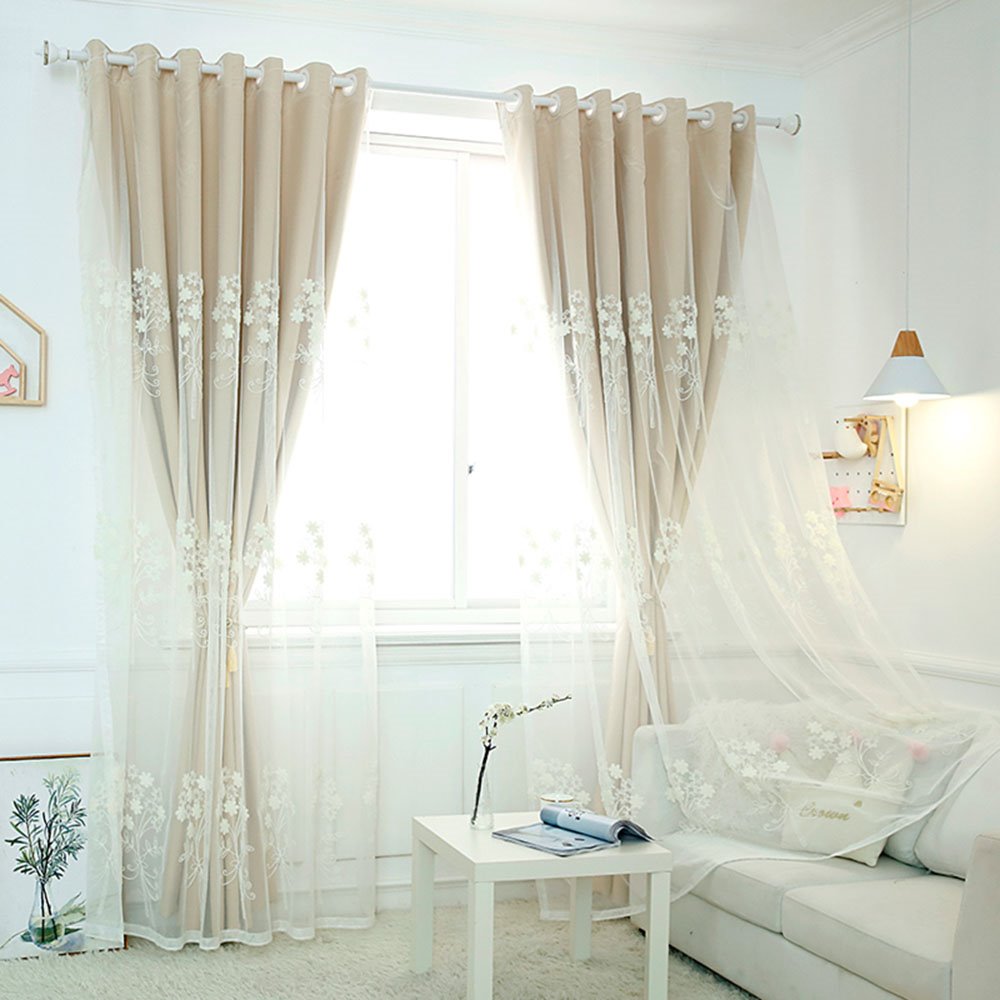 Embroidery Window Curtain Sets Khaki and Gray Sheer and Lining Blackout Curtain for Living Room Bedroom Decoration 2 Panels Drapes