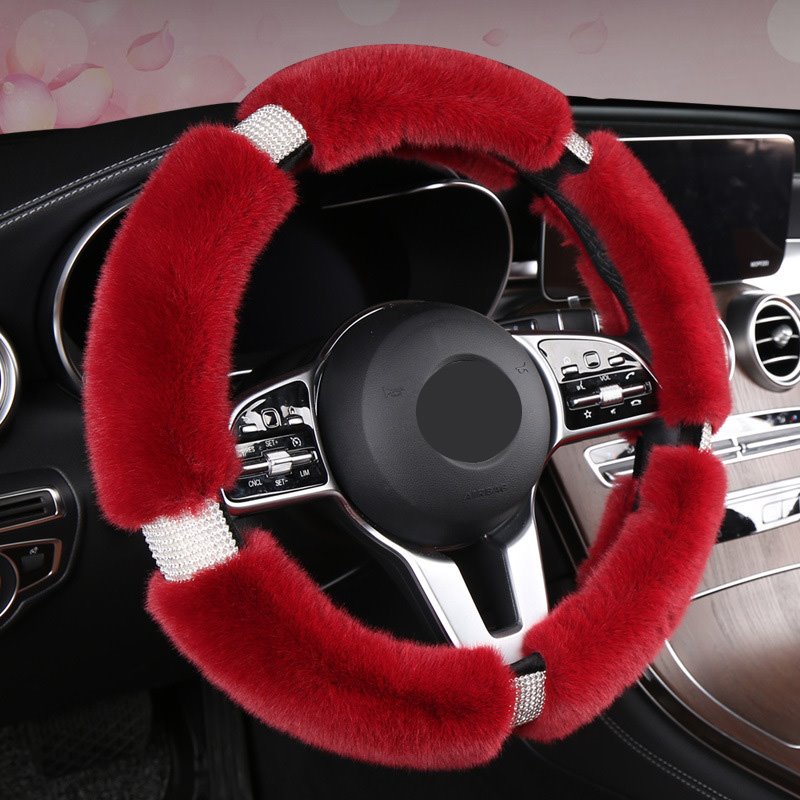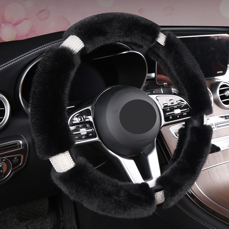 Fluffy Steering Wheel Cover for Women, Universal Rhinestone Bling Comfortable Non-Slip Luxurious Faux Wool & Glam Vehicle for Ladies, Girls, 15 Inch