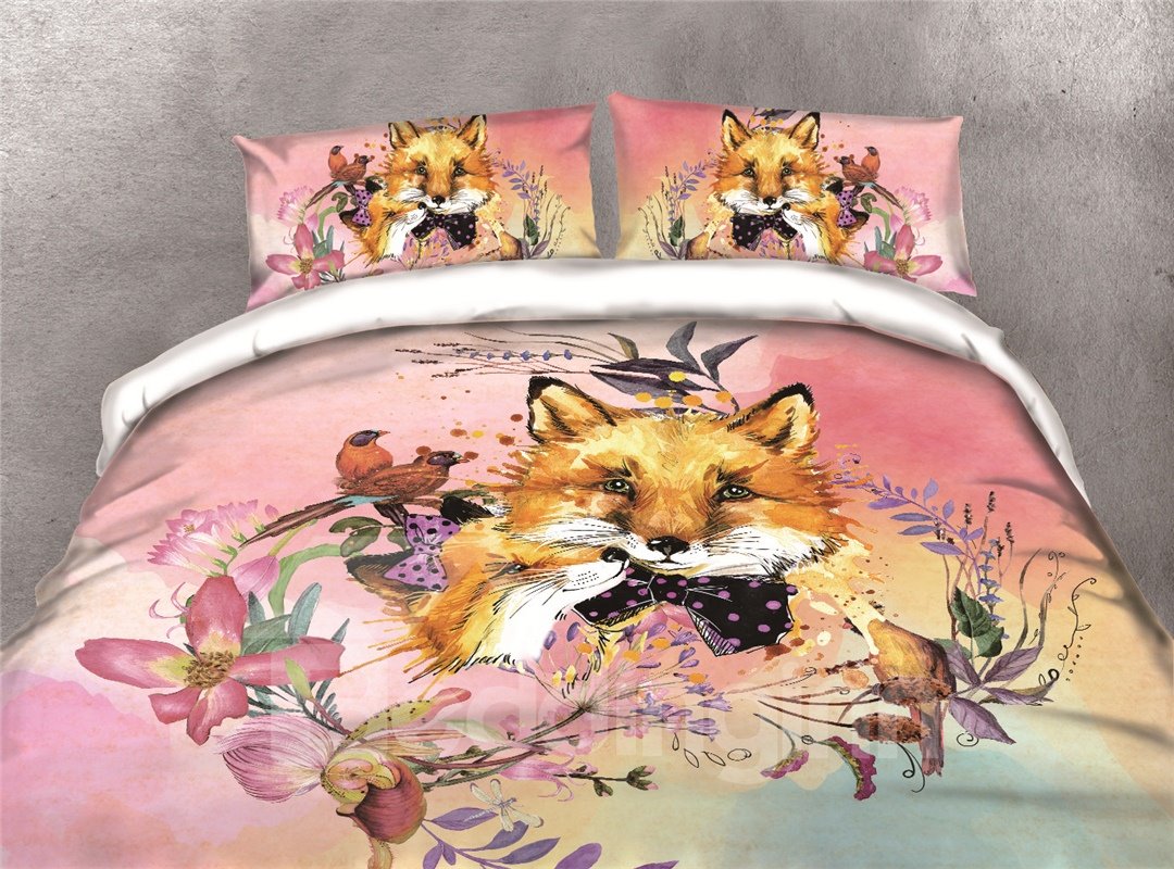 Loving Foxes and Flower Watercolor Printing Polyester 3D 4-Piece Bedding Sets/Duvet Covers