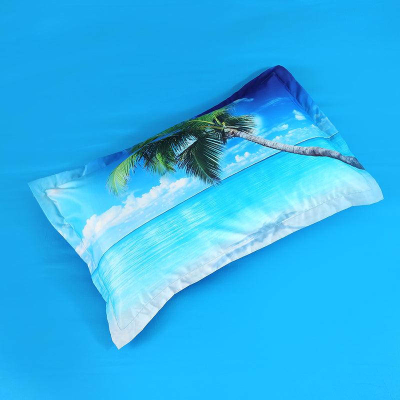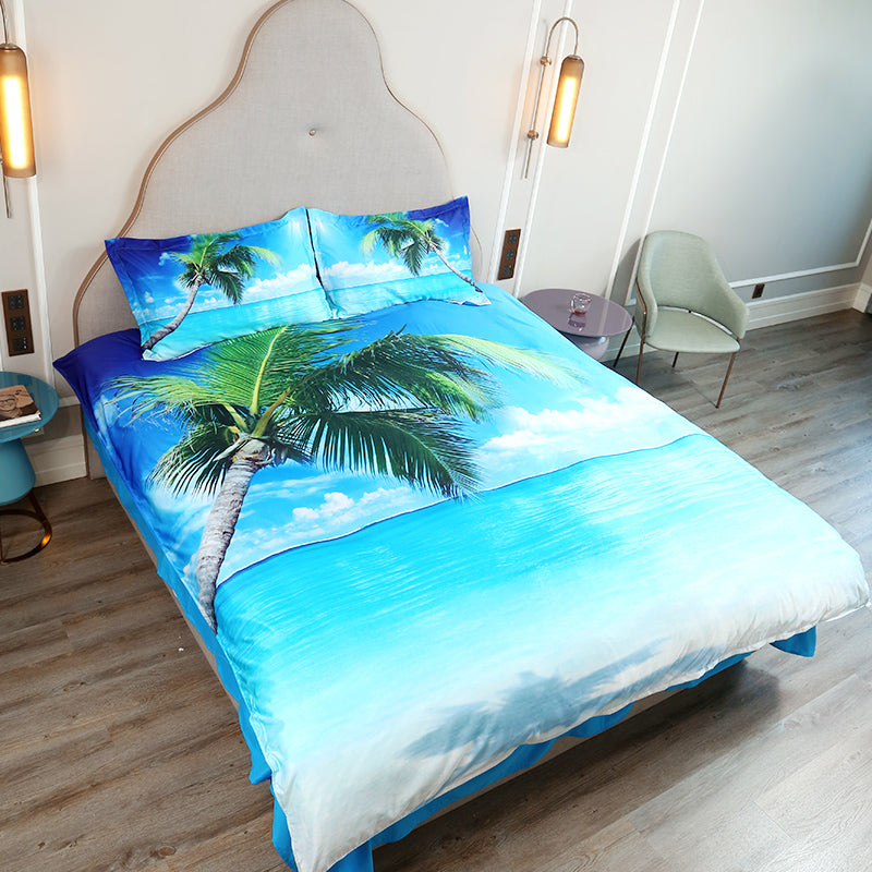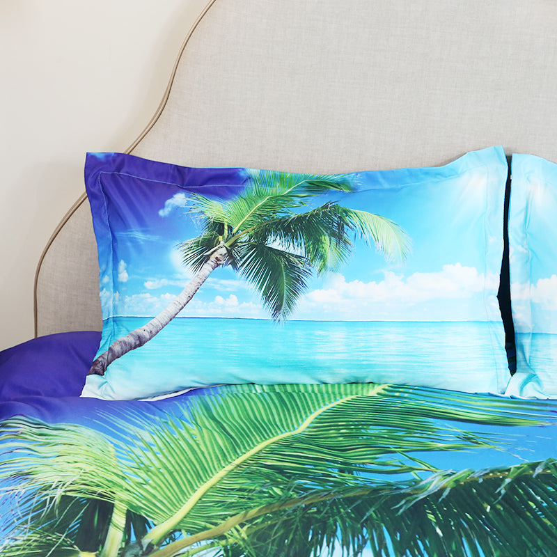 Coastal Beach Bedding Set, Palm Tree Blue Sea 4-Piece 3D Scenery Print Duvet Cover Set Microfiber with Flat Sheet 2 Pillowcases