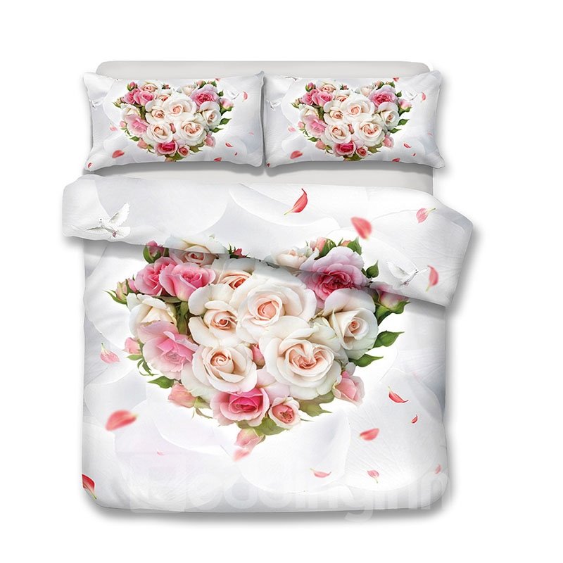 Pink Roses And Champagne Roses In A Heart Shape Printed 3-Piece Bedding Sets/Duvet Covers