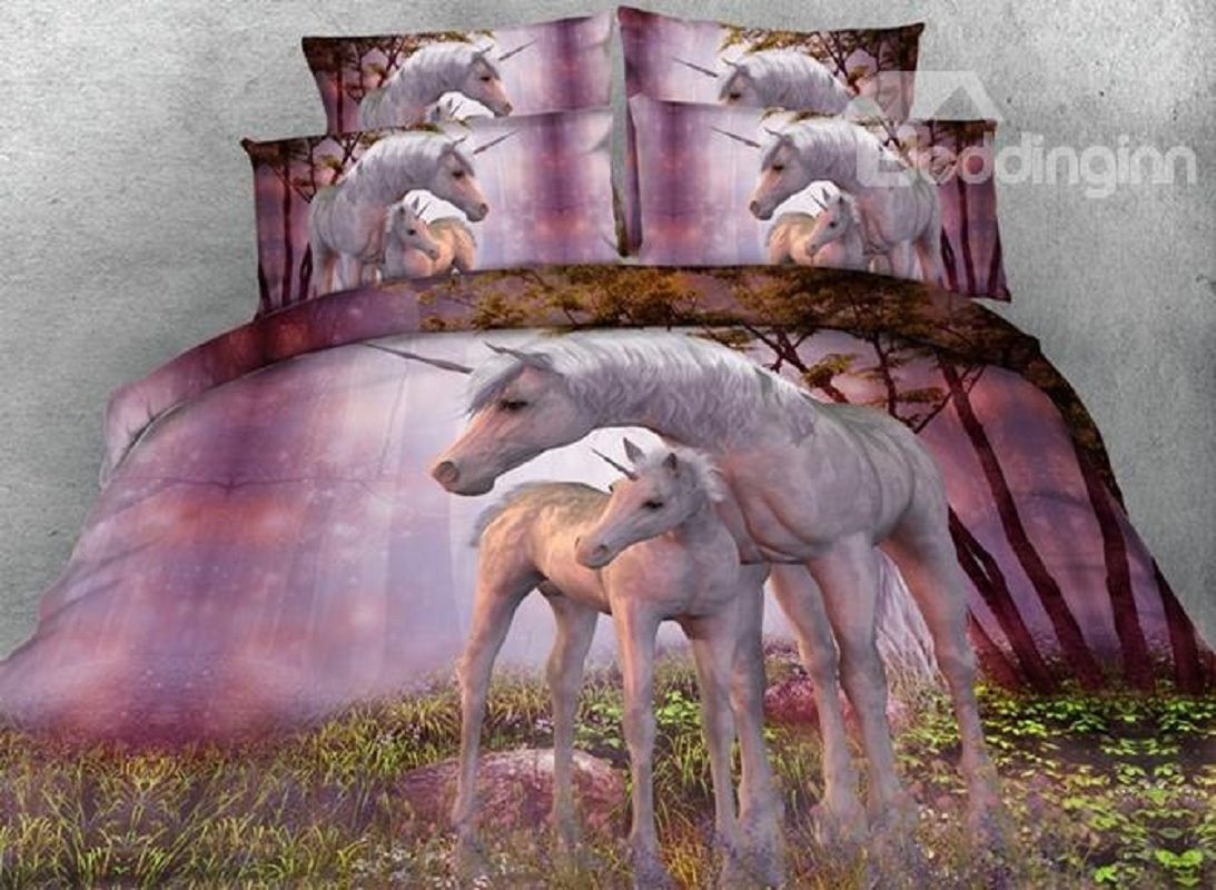 Pink Unicorns 3D 4-Piece Animal Print Bedding Set/Duvet Cover Set Soft Polyester