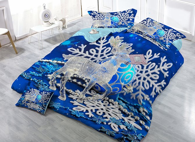 Reindeer Blue Snowflake Wear-resistant Breathable High Quality 60s Cotton 4-Piece 3D Bedding Sets