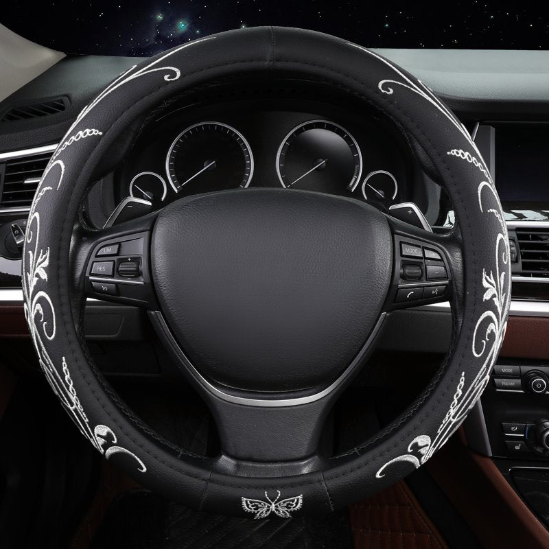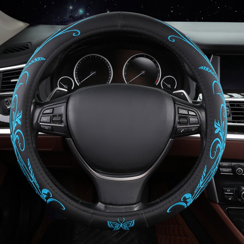 Wear-resistant Breathable Non-slip Leather Material Butterfly and Lavender Embroidery Pattern Suitable for Most Round Steering Wheels