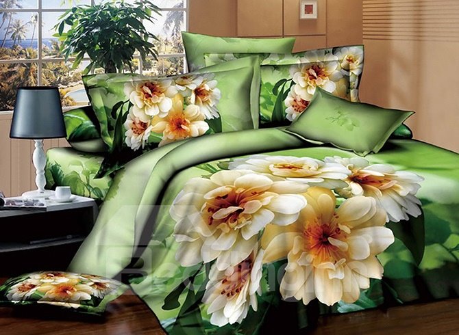 White Blooming Flowers Design Green 4-Piece Cotton Duvet Cover Sets