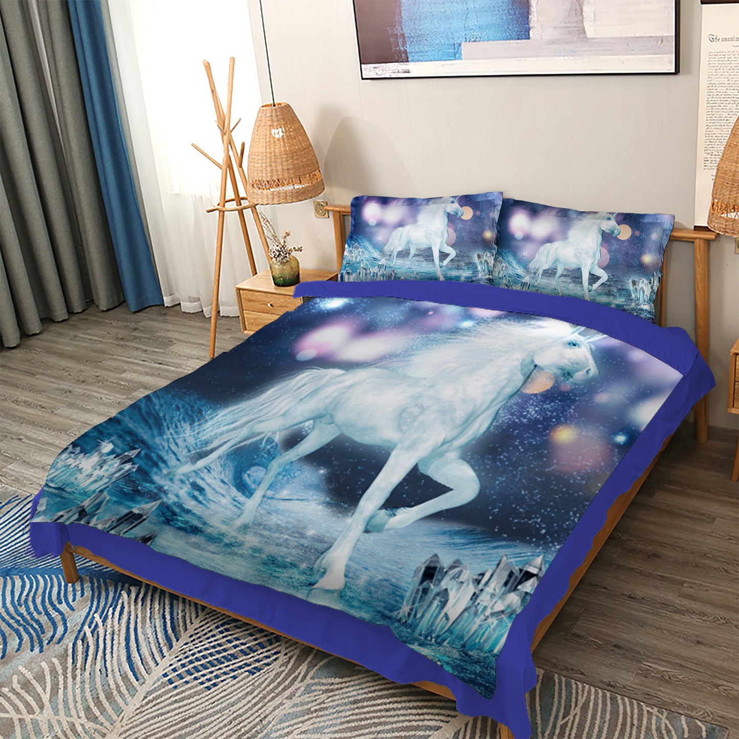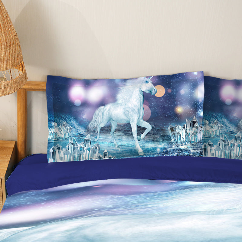 This duvet cover set features a unicorn in the ice world. The bedding set is made of brushed microfiber, so it feels soft, fine and smooth to the touch. The set contains 1 duvet cover, 1 flat sheet and 2 pillowcases, meeting the basic needs to set up your bedding. The duvet cover comes with zipper closure and the pillowcases envelope style, making it easy to change your duvet and pillows to unicorn themed look for your bedroom, guest bedroom or vacation room. Get this unicorn duvet cover set to spark the imagination and to turn some heads.